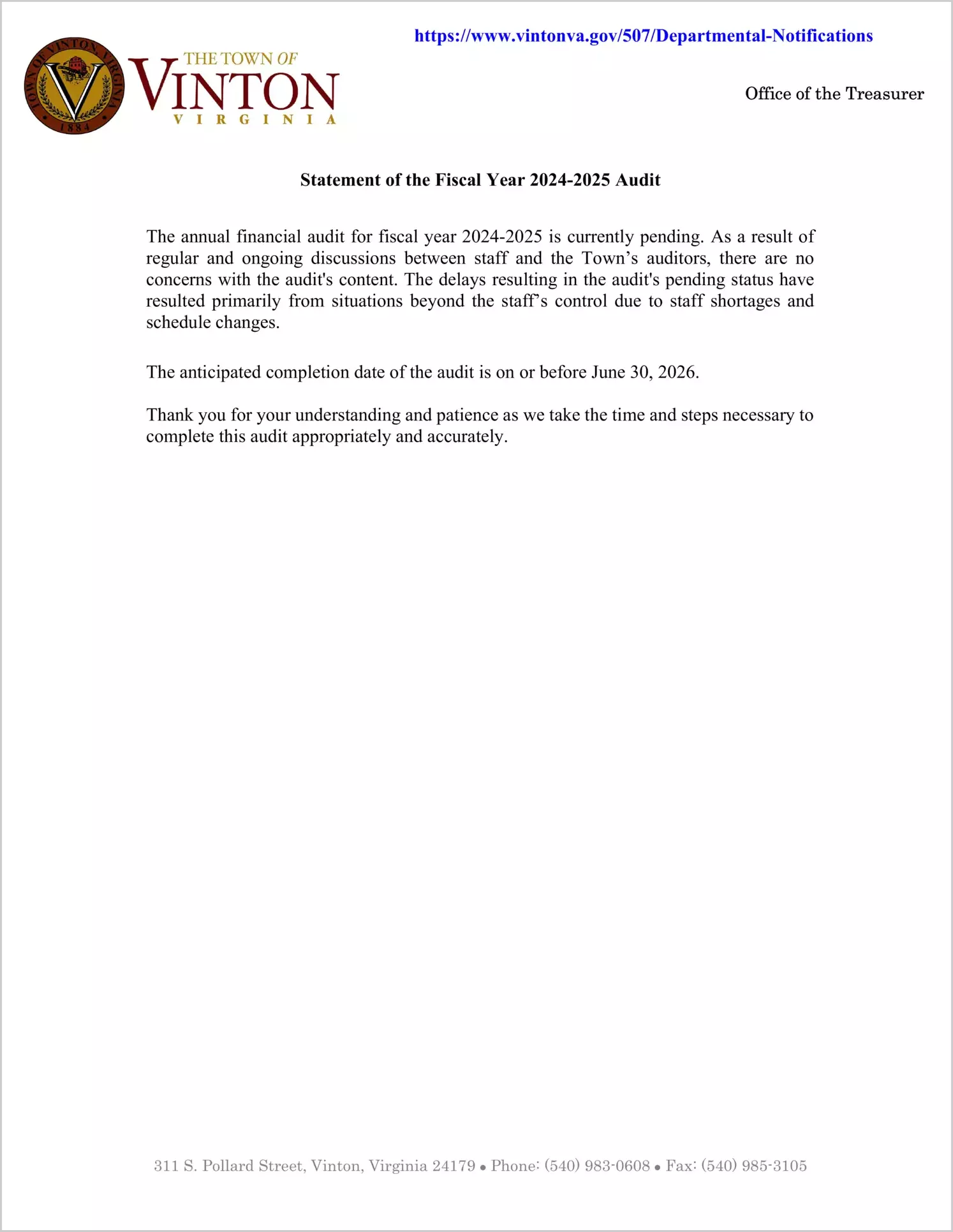 Locality is delayed in submitting its FY2024 audited financial report to the APA. Refer to the Full Report link for locality's notification regarding the delay and expected completion.