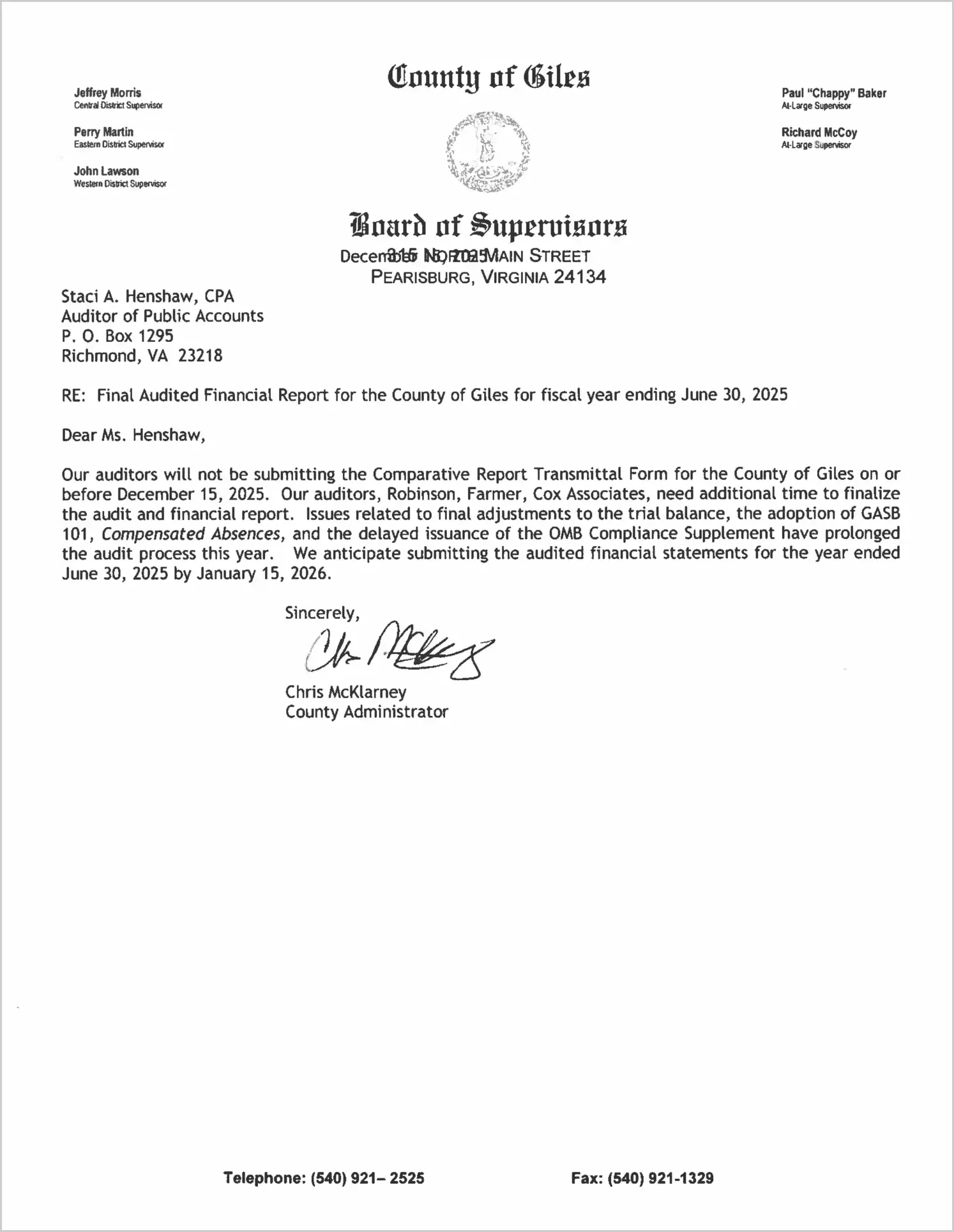 Locality is delayed in submitting its FY2025 audited financial report to the APA. Refer to the Full Report link for locality's notification regarding the delay and expected completion.