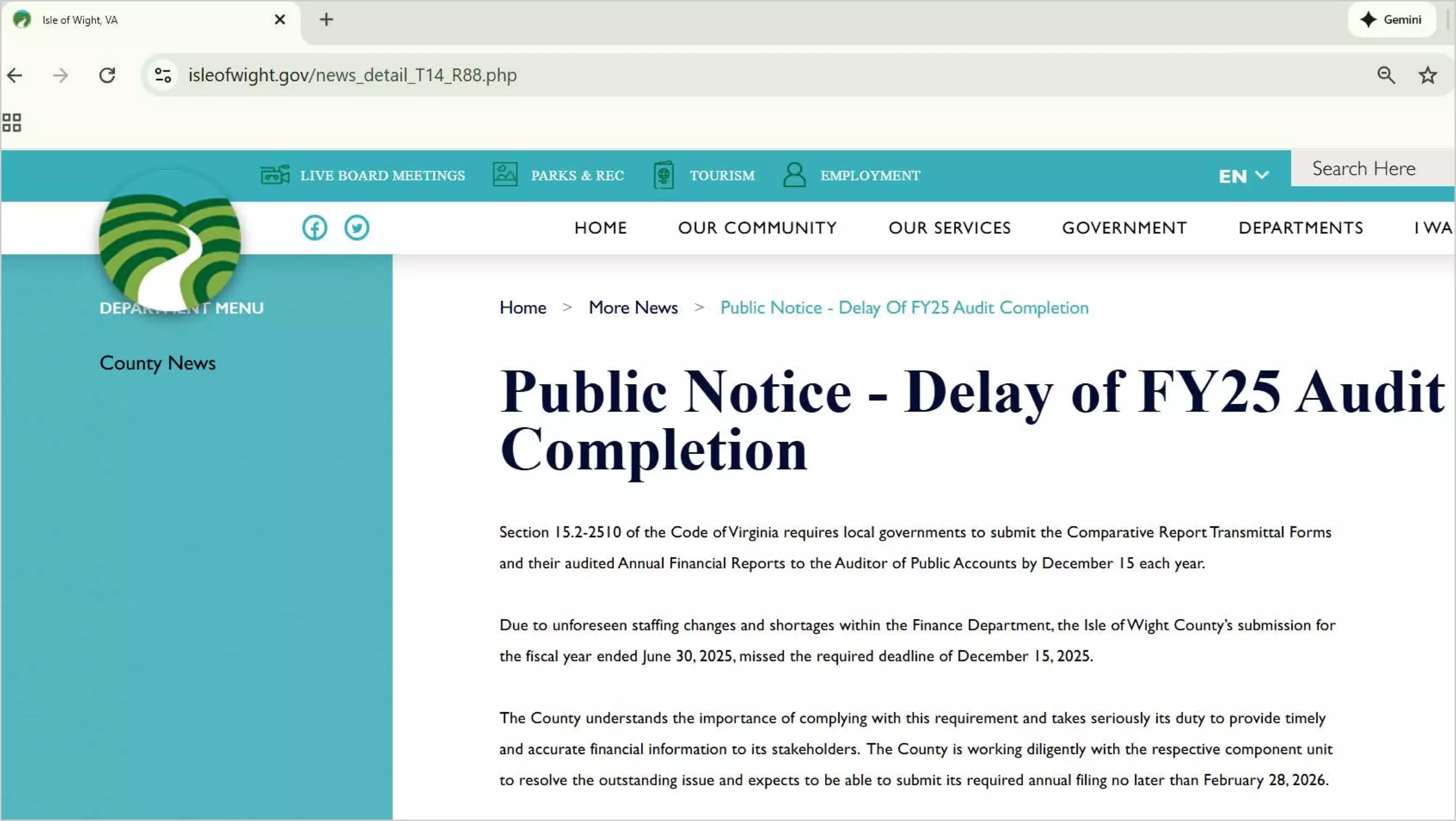 Locality is delayed in submitting its FY2025 audited financial report to the APA. Refer to the Full Report link for locality's notification regarding the delay and expected completion.