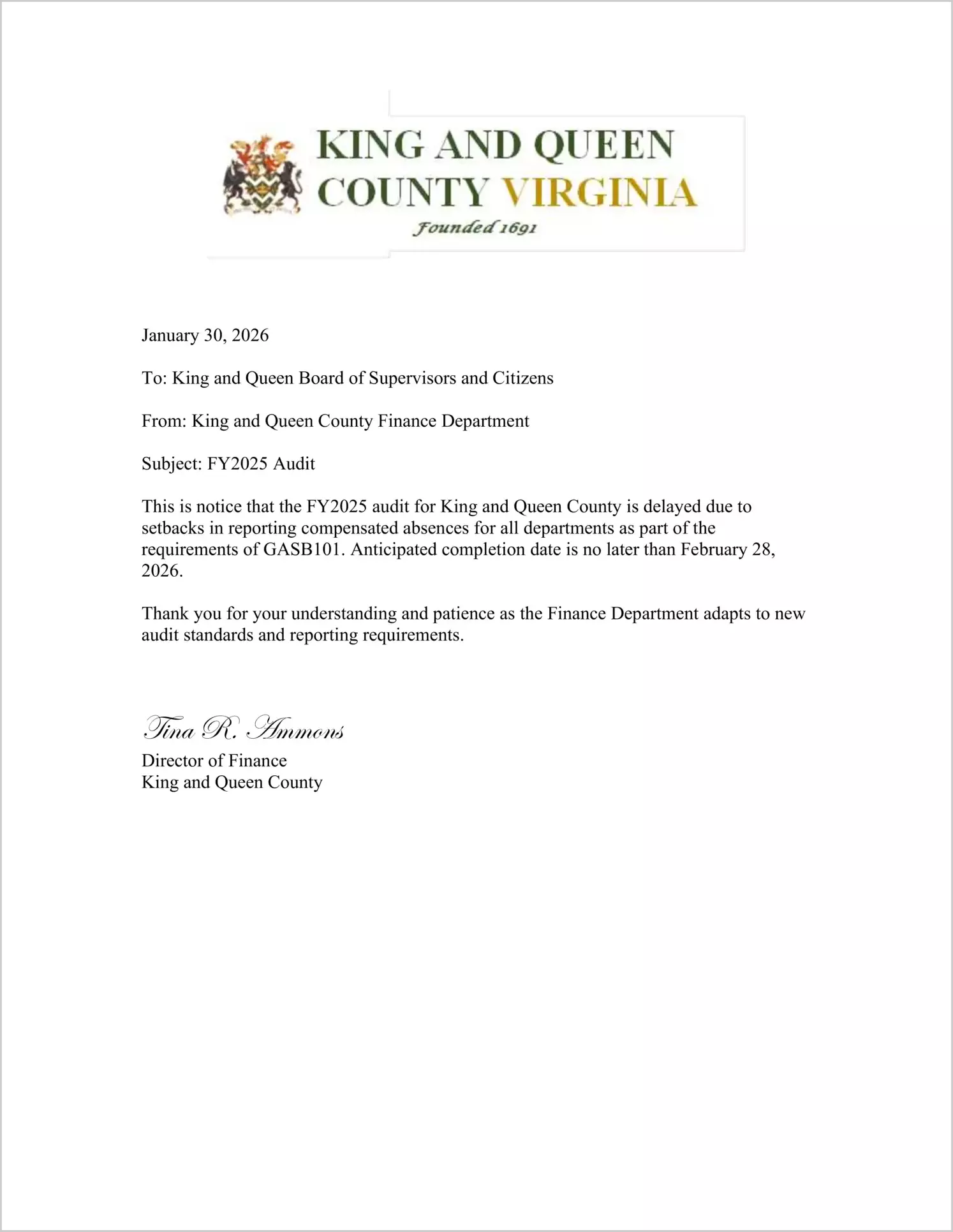 2025 Annual Financial Report for County of King & Queen - Delayed