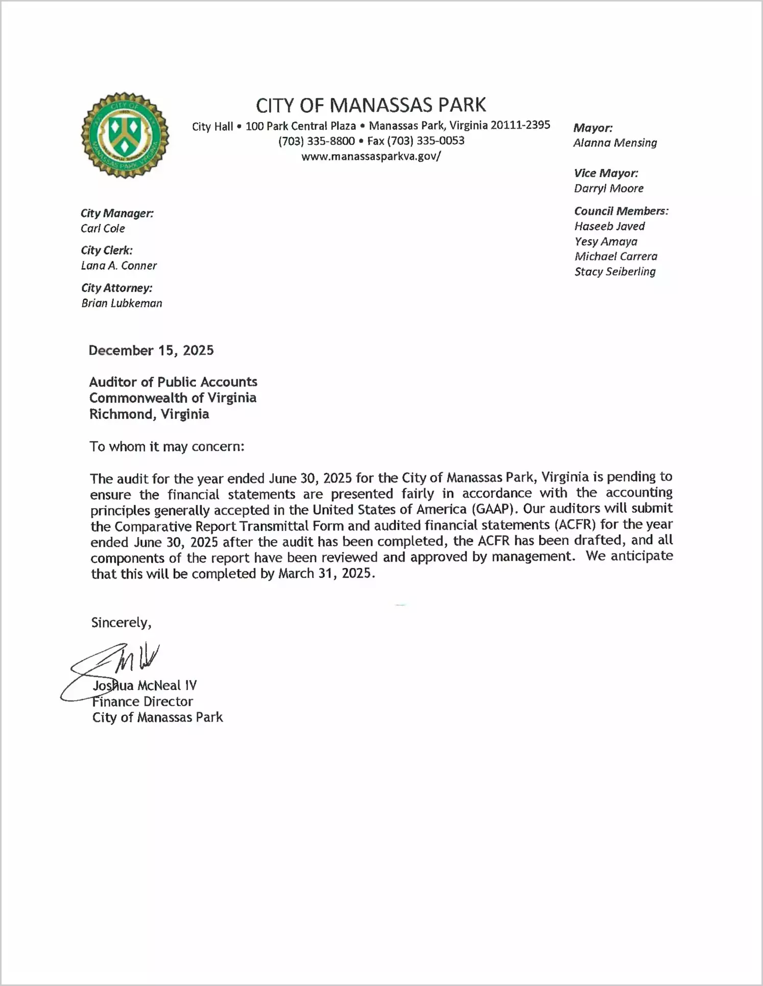 2025 Annual Financial Report for City of Manassas Park - Delayed