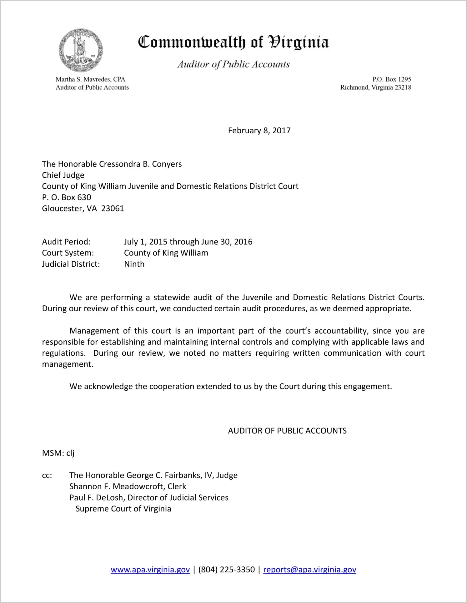 Juvenile and Domestic Relations Court for the County of King William for the period July 1, 2015 through June 30, 2016