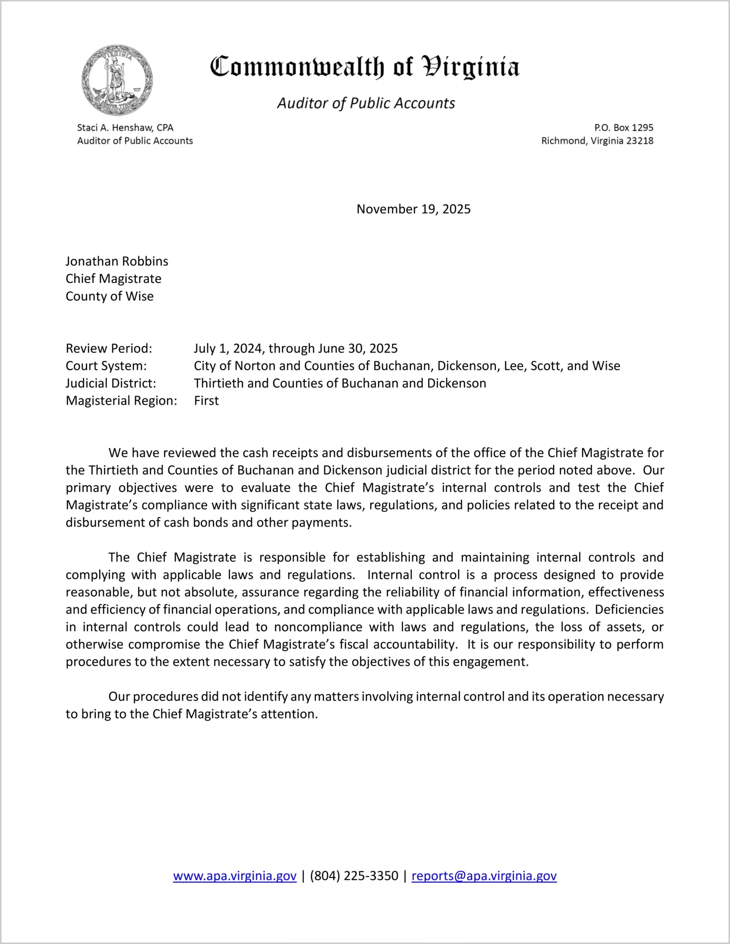 Report issued for the Magistrate of the Judicial District 30 for the period July 1, 2024 through June 30, 2025