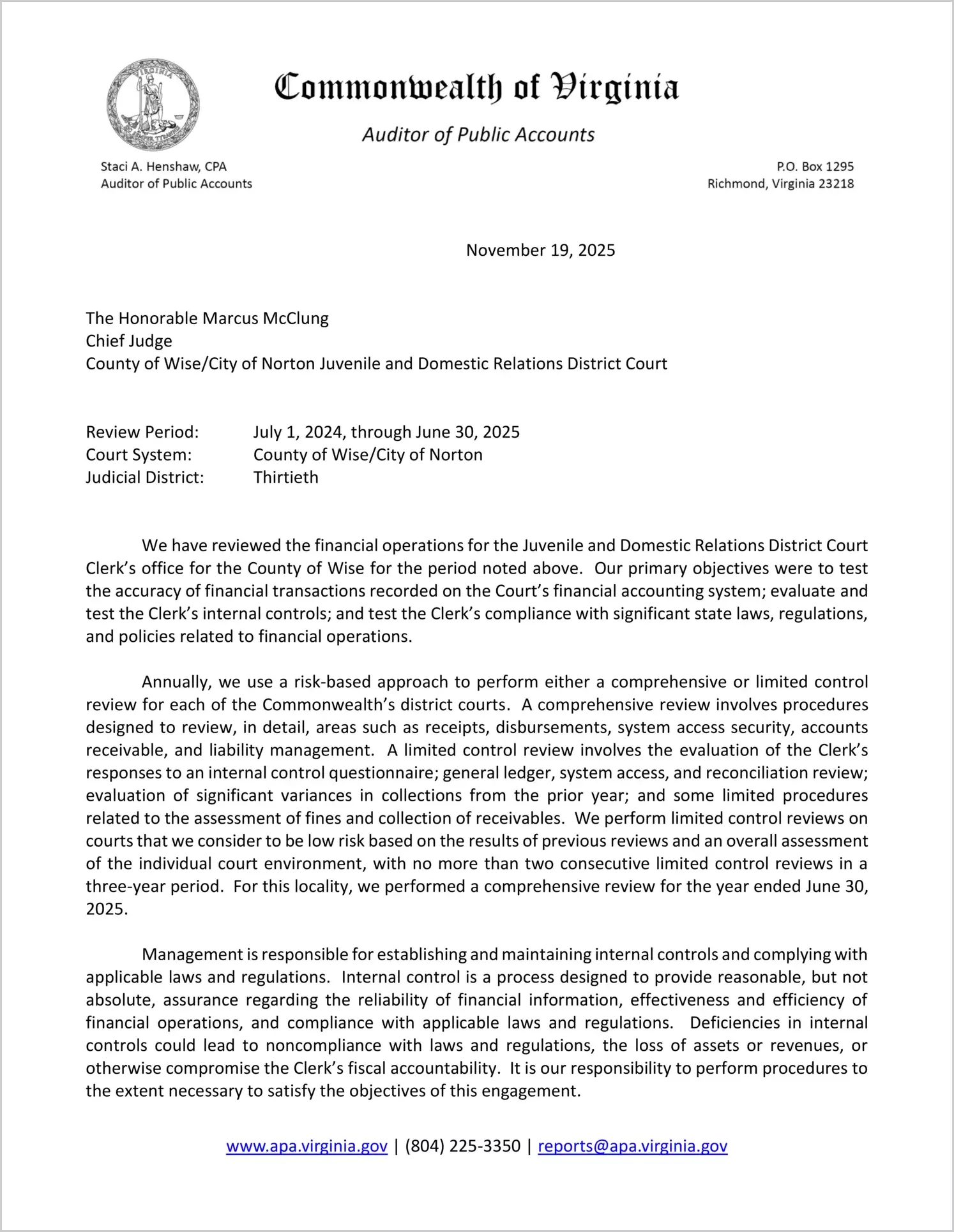 Report issued for the Juvenile and Domestic Relations District Court for the County of Wise and the City of Norton for the period July 1, 2024 through June 30, 2025