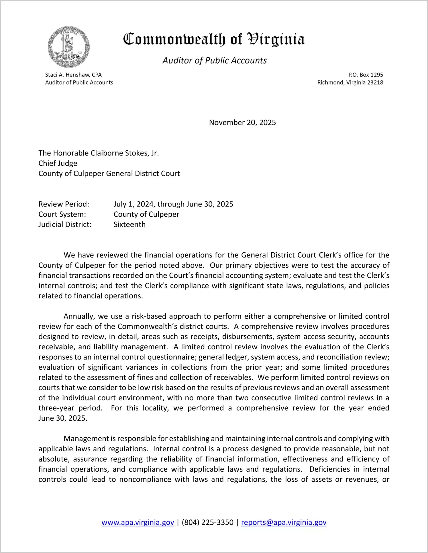 General District Court for the County of Culpeper for the period July 1, 2024 through June 30, 2025