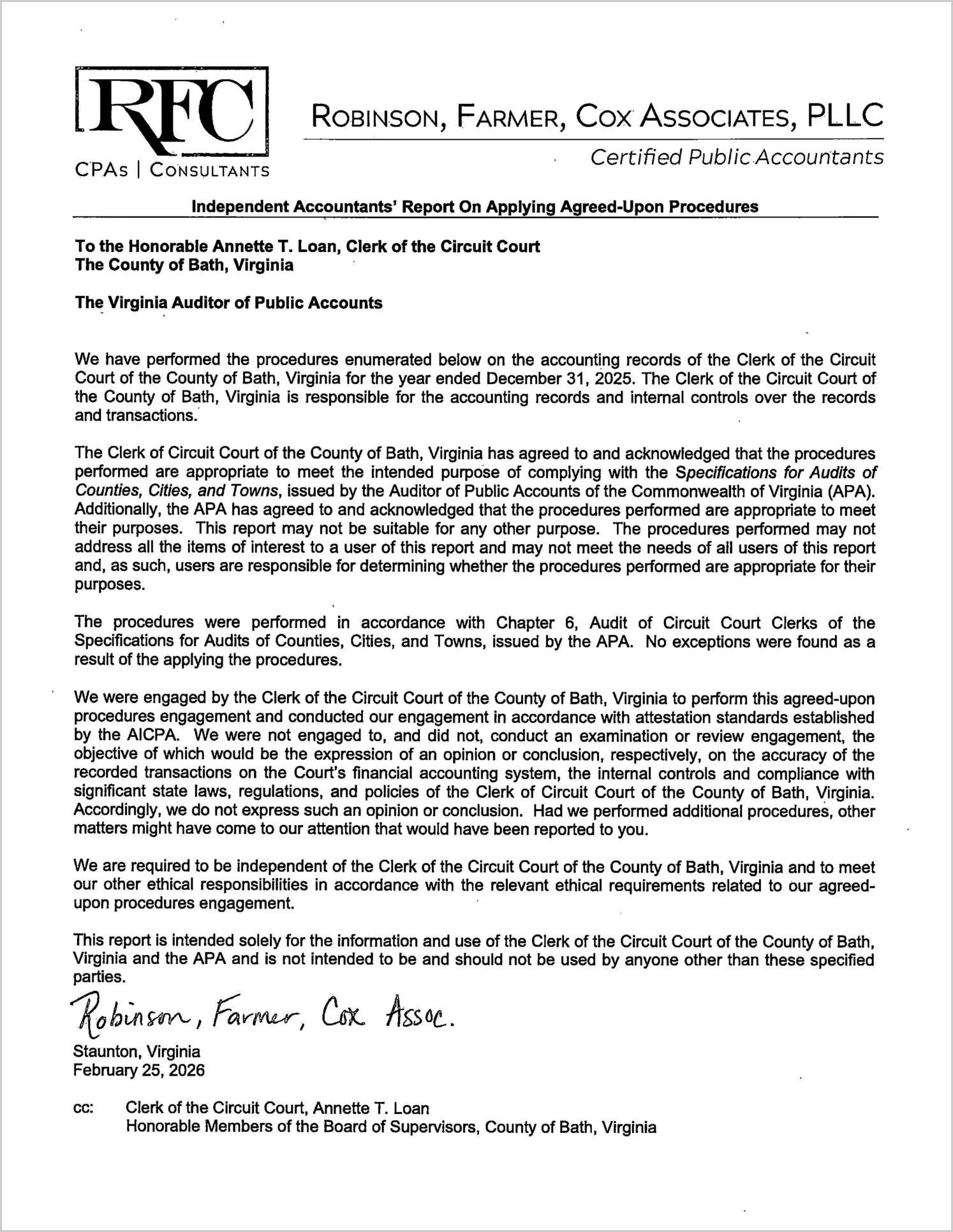 Clerk of the Circuit Court for the County of Bath for the period January 1, 2025 through December 31, 2025