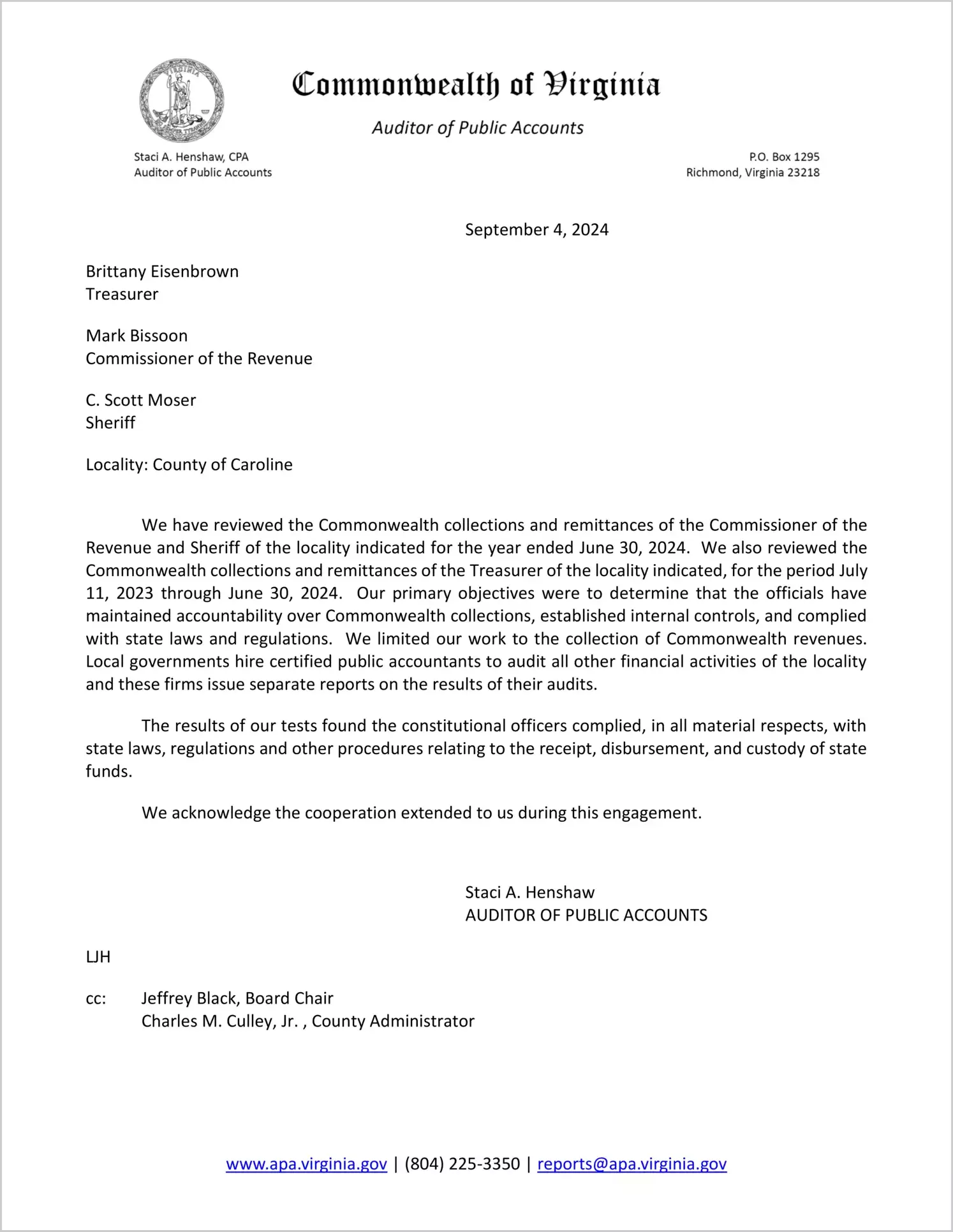 Report issued for the Commonwealth Collections and Remittances for the Treasurer, Commissioner of the Revenue, and Sheriff for the County of Caroline for the year ended June 30, 2024