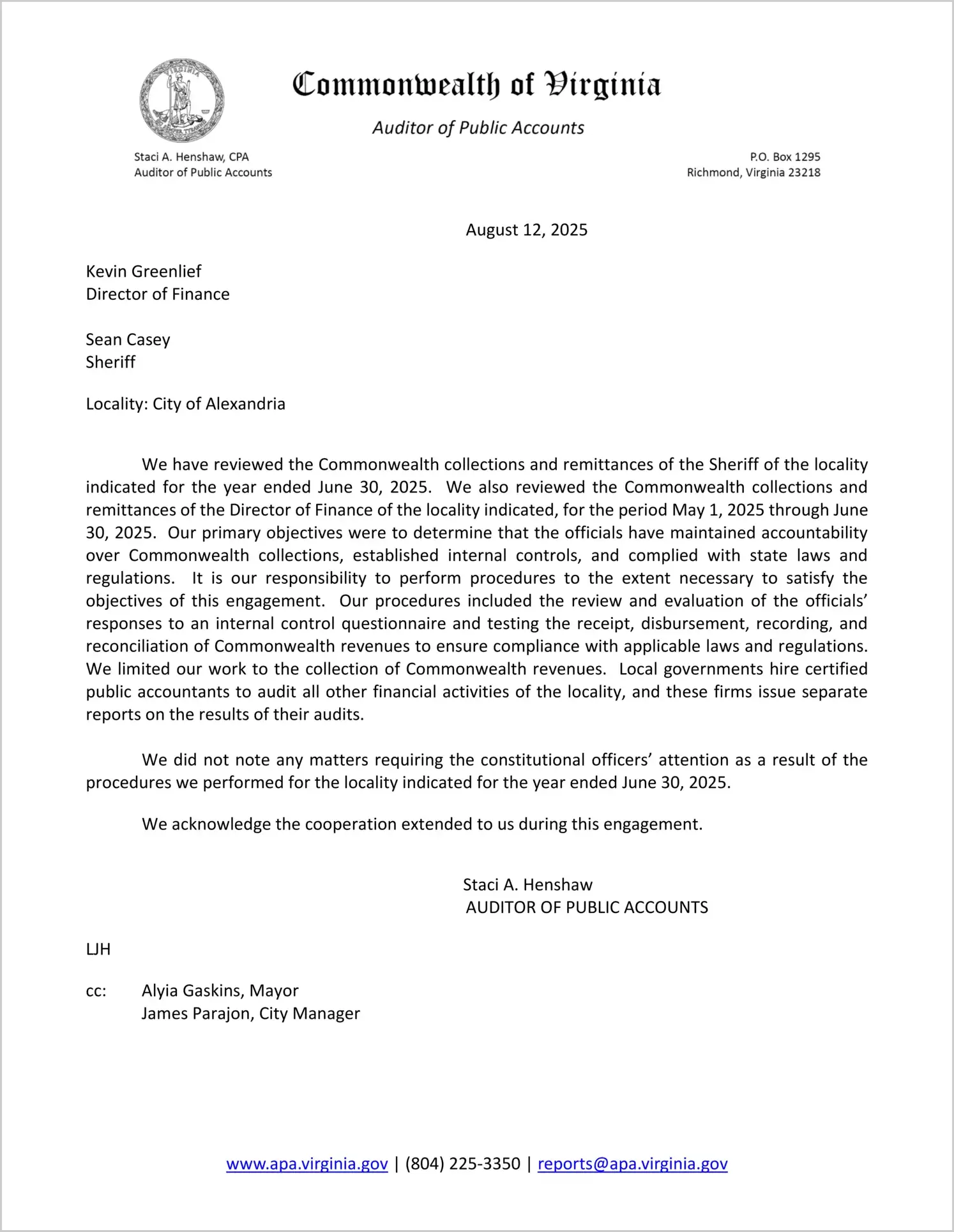 Report issued for the Commonwealth Collections and Remittances of the Sheriff for the City of Alexandria for the year ended June 30, 2025, and the Director of Finance for the period May 1, 2025 through June 30, 2025