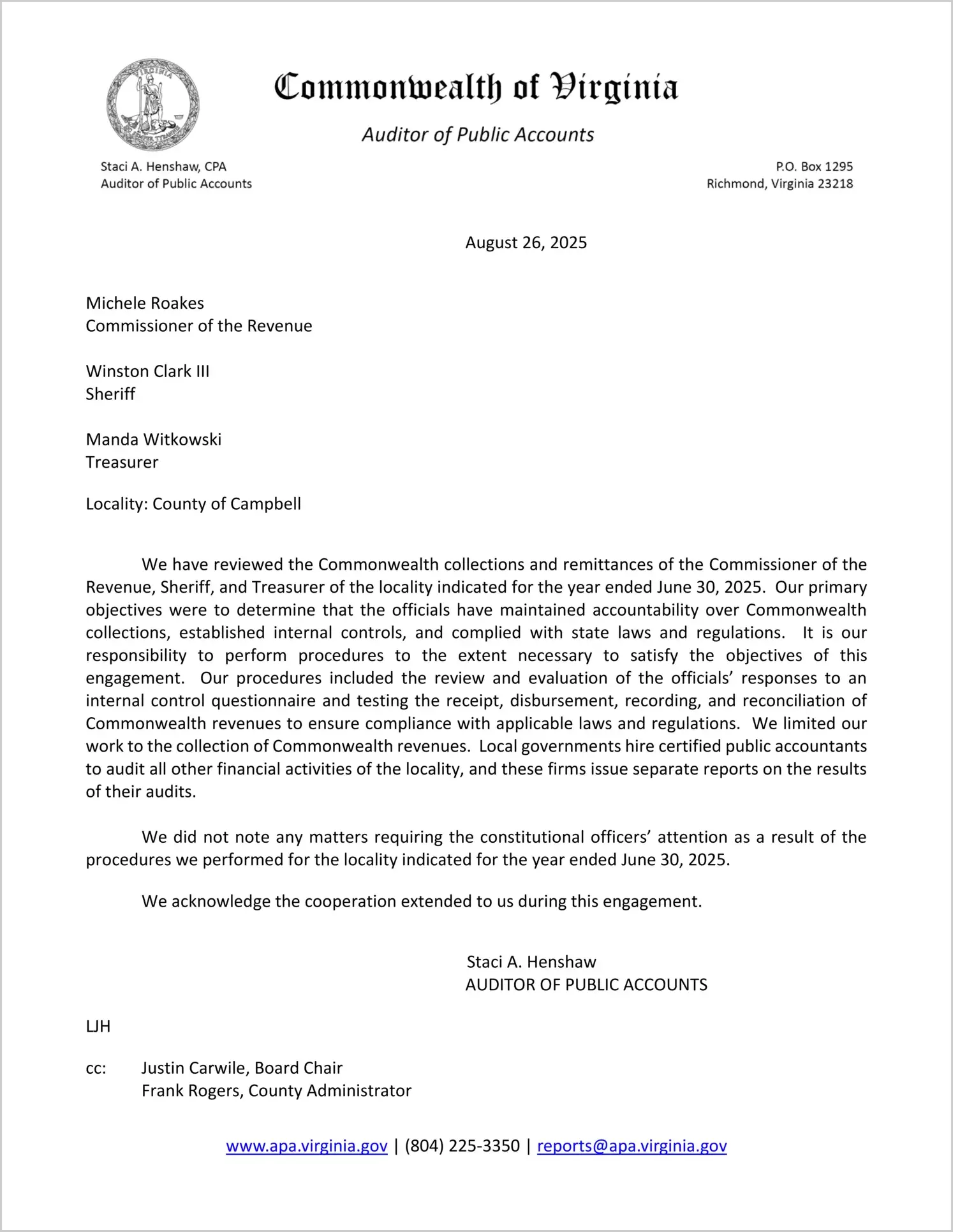 Report issued for the Commonwealth Collections and Remittances of the Commissioner of the Revenue, Sheriff, and Treasurer for the County of Campbell for the year ended June 30, 2025