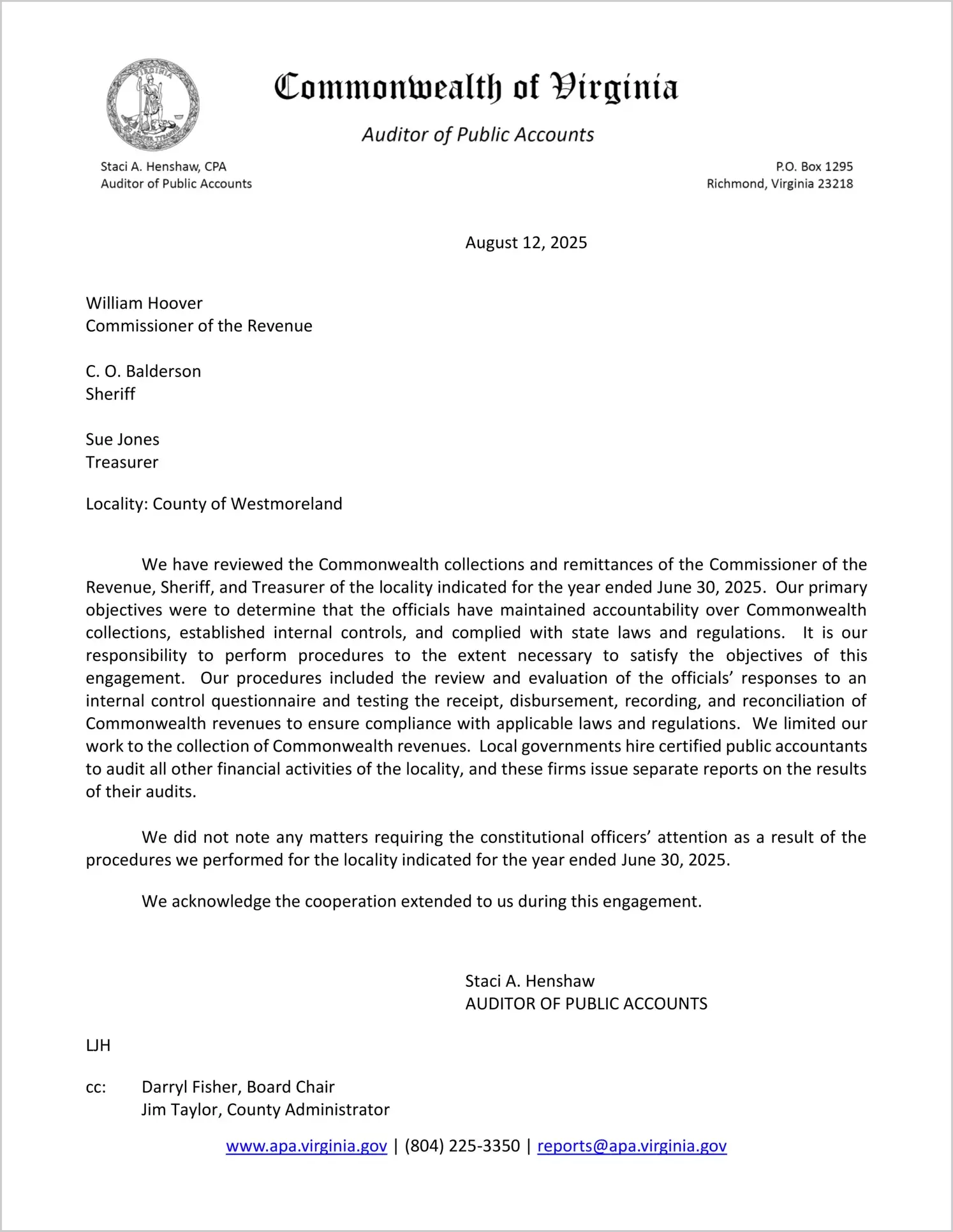 Report issued for the Commonwealth Collections and Remittances of the Commissioner of the Revenue, Sheriff, and Treasurer for the County of Westmoreland for the year ended June 30, 2025