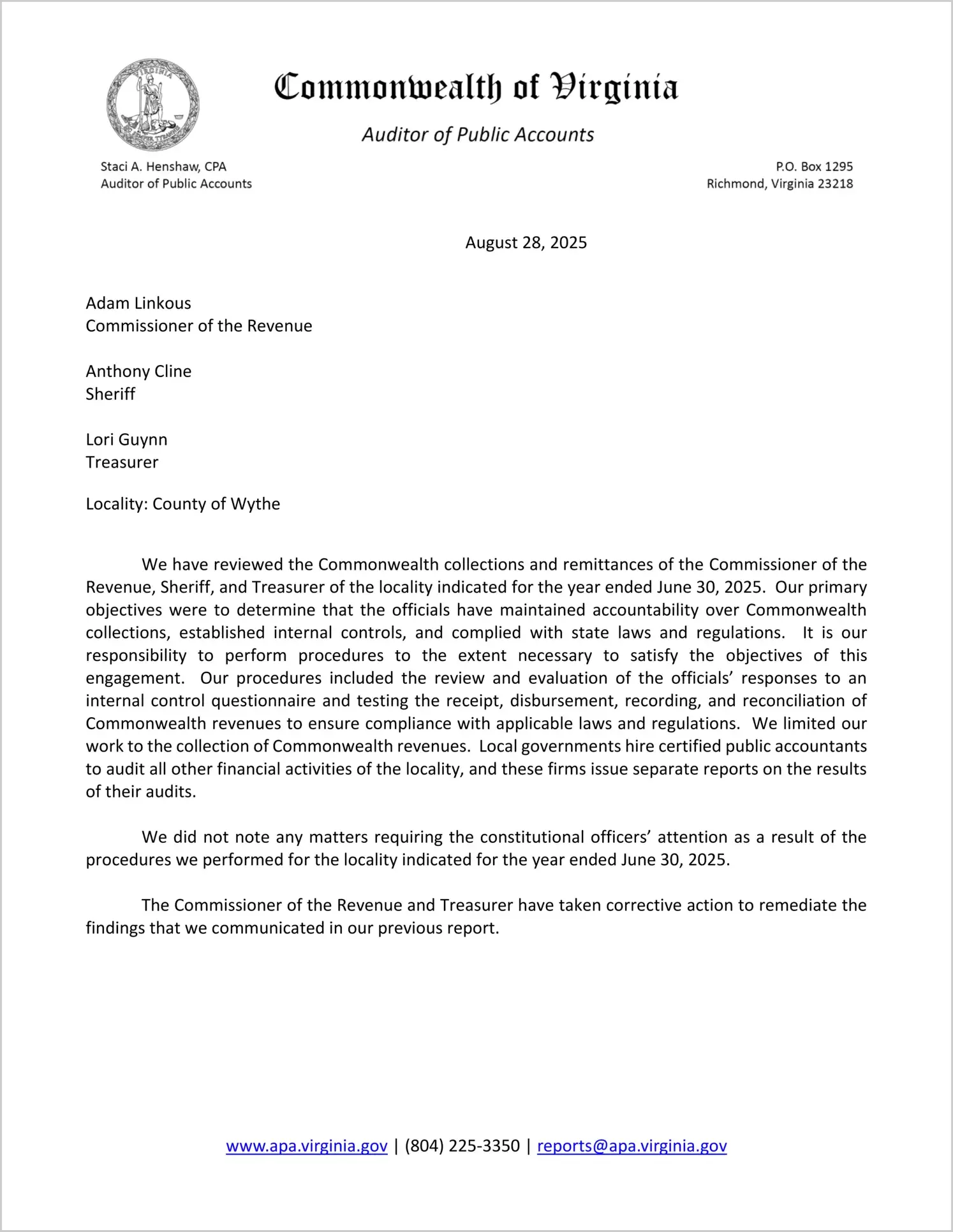 Report issued for the Commonwealth Collections and Remittances of the Commissioner of the Revenue, Sheriff, and Treasurer for the County of Wythe for the year ended June 30, 2025