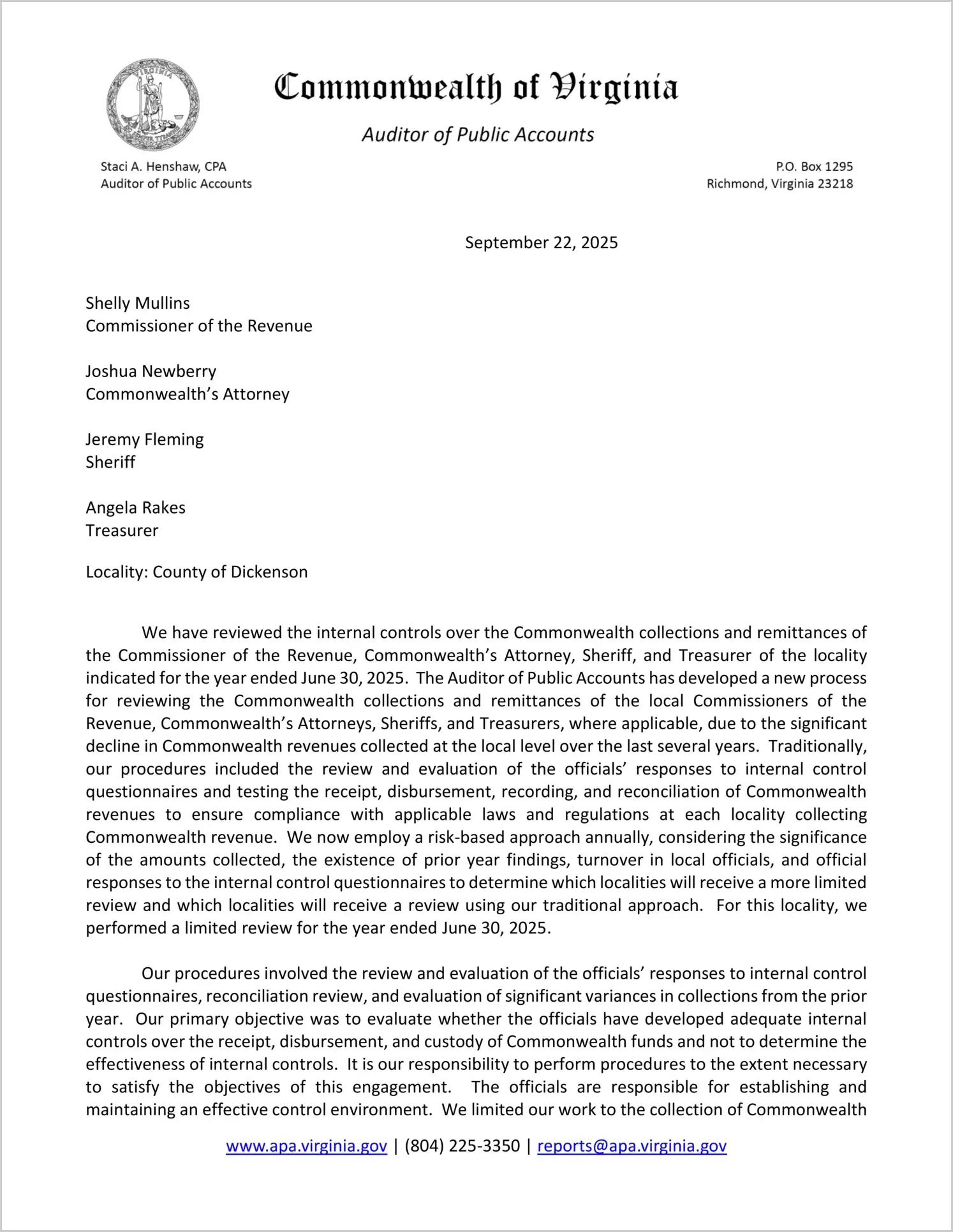 Report issued for the Commonwealth Collections and Remittances of the Commissioner of the Revenue, Commonwealth's Attorney, Sheriff, and Treasurer for the County of Dickenson for the year ended June 30, 2025