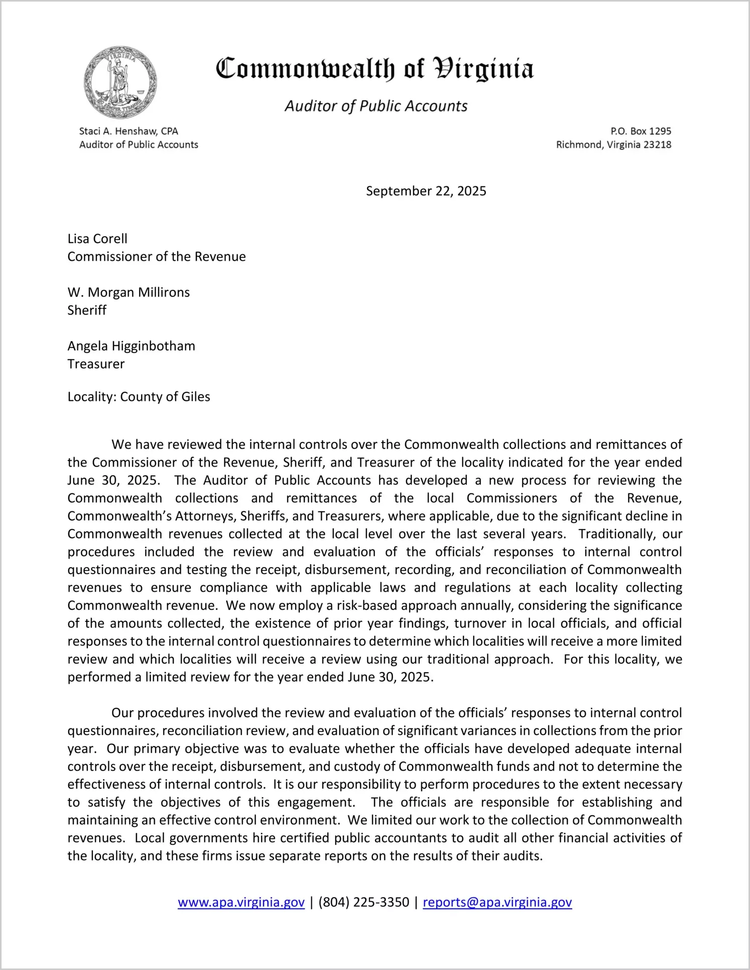 Report issued for the Commonwealth Collections and Remittances of the Commissioner of the Revenue, Sheriff, and Treasurer for the County of Giles for the year ended June 30, 2025