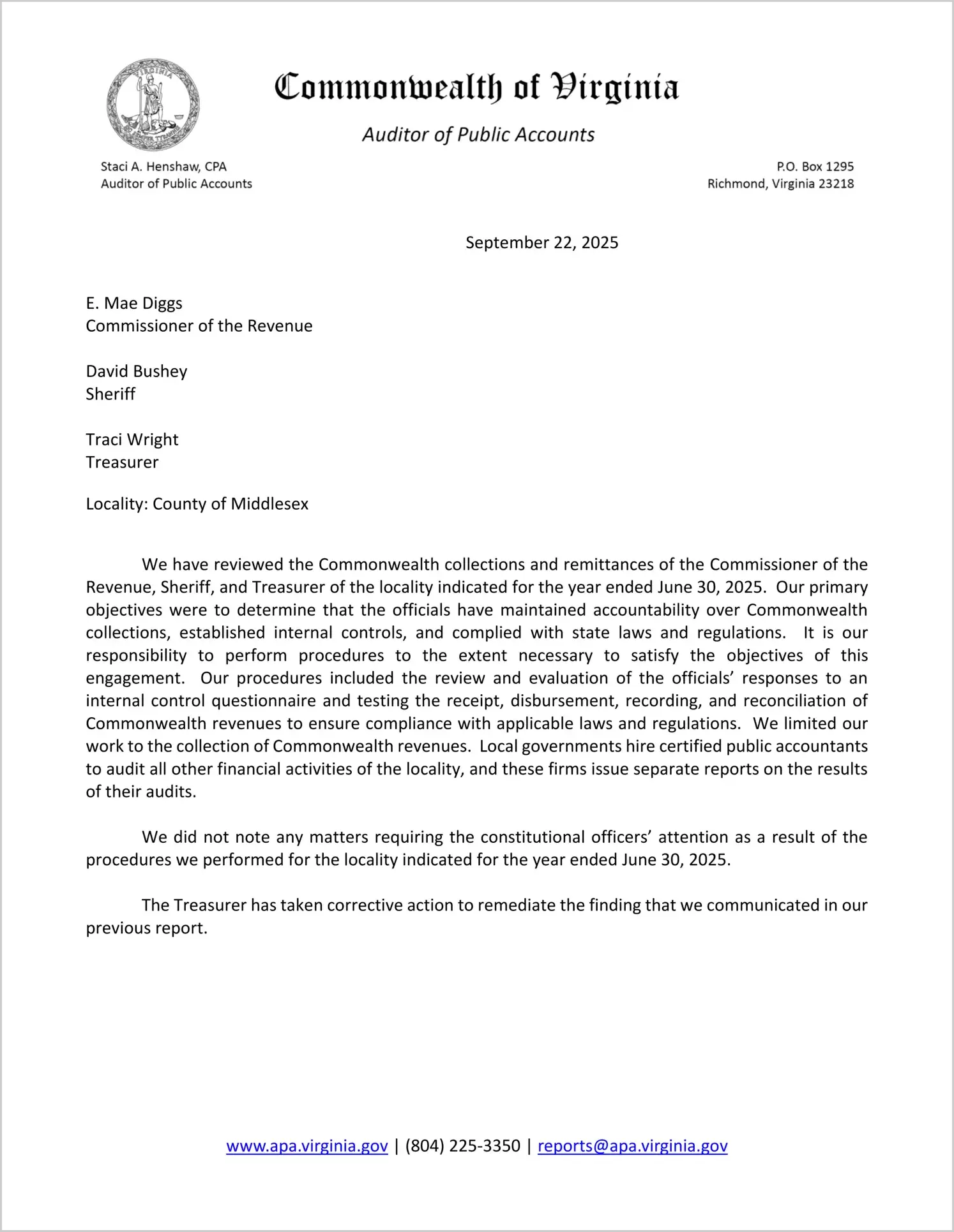 Report issued for the Commonwealth Collections and Remittances of the Commissioner of the Revenue, Sheriff, and Treasurer for the County of Middlesex for the year ended June 30, 2025