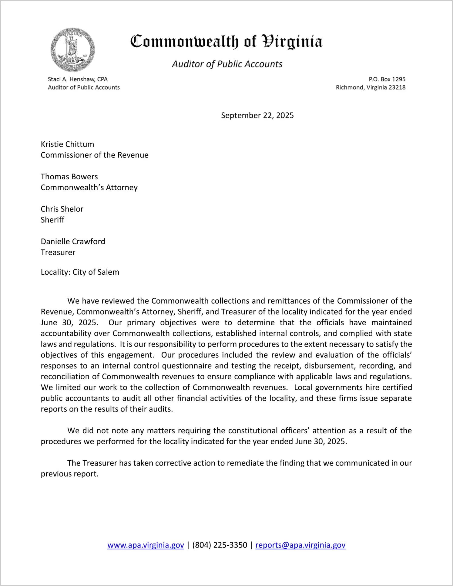 Report issued for the Commonwealth Collections and Remittances of the Commissioner of the Revenue, Commonwealth's Attorney, Sheriff, and Treasurer for the City of Salem for the year ended June 30, 2025