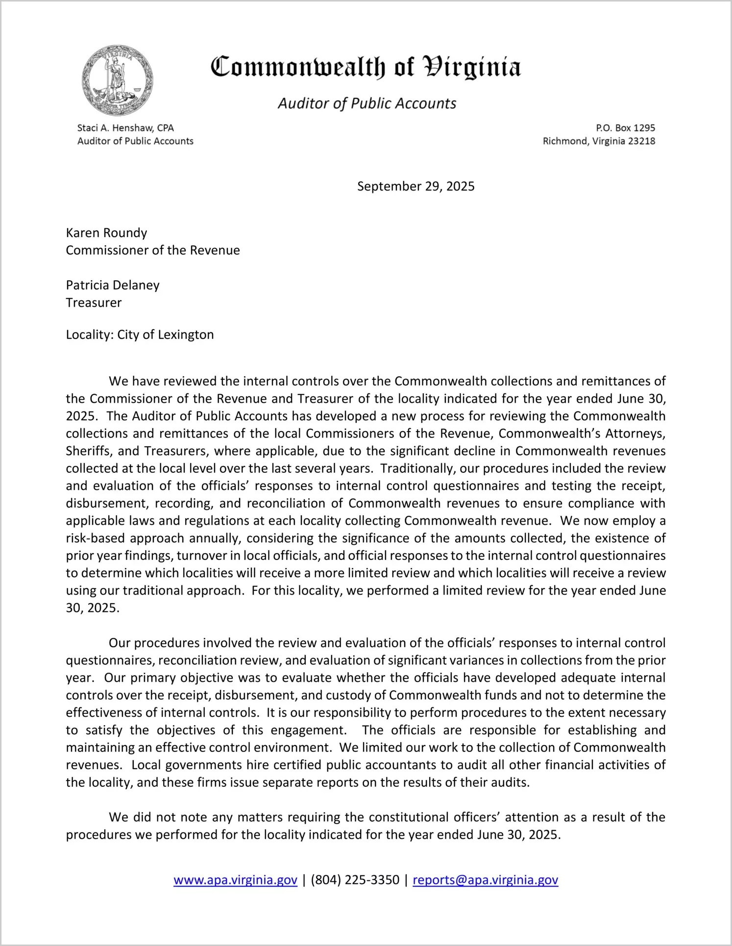 Report issued for the Commonwealth Collections and Remittances of the Commissioner of the Revenue and Treasurer for the City of Lexington for the year ended June 30, 2025
