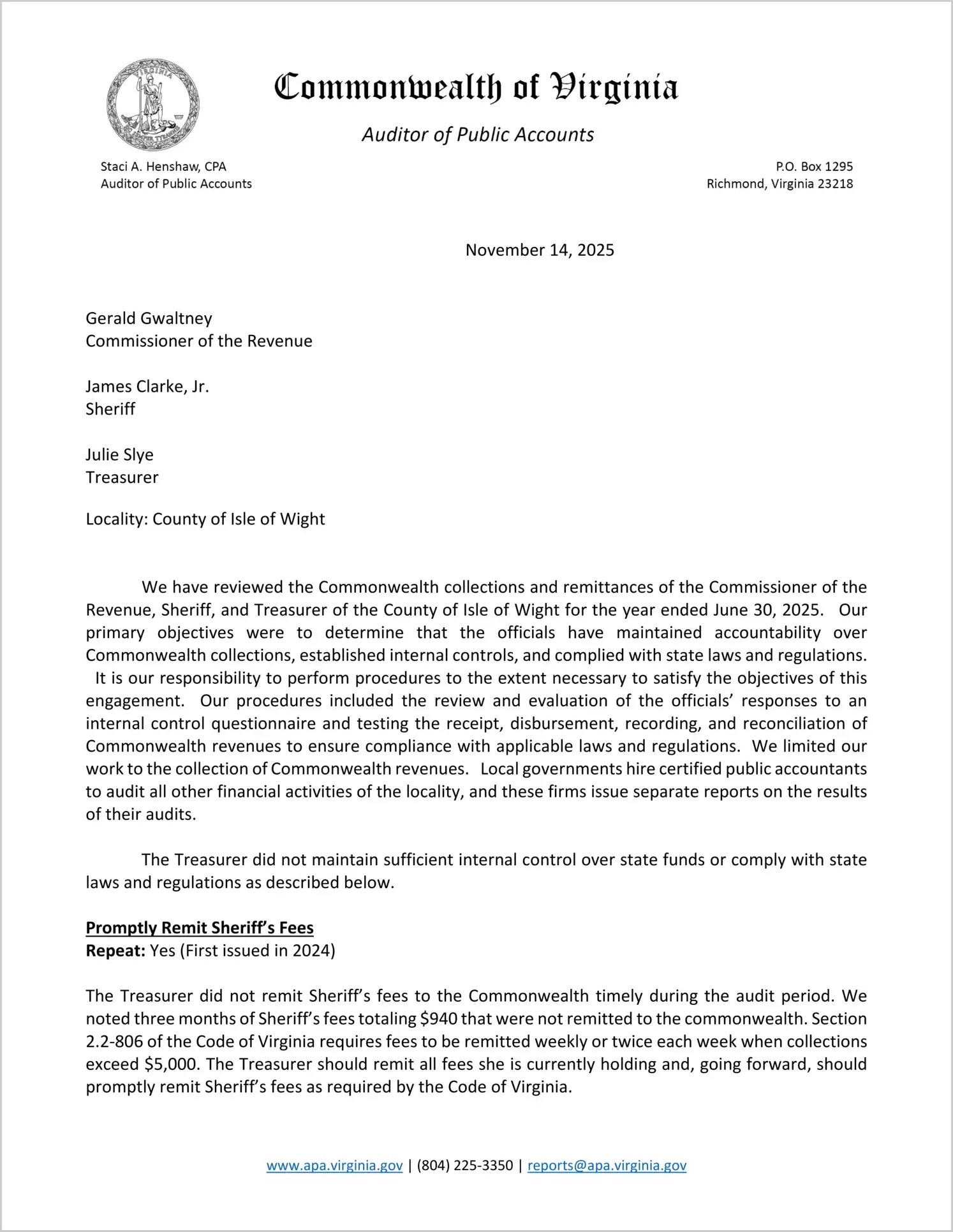 Commonwealth Collections and Remittances of the Commissioner of the Revenue, Sheriff, and Treasurer of the County of Isle of Wight for the year ended June 30, 2025