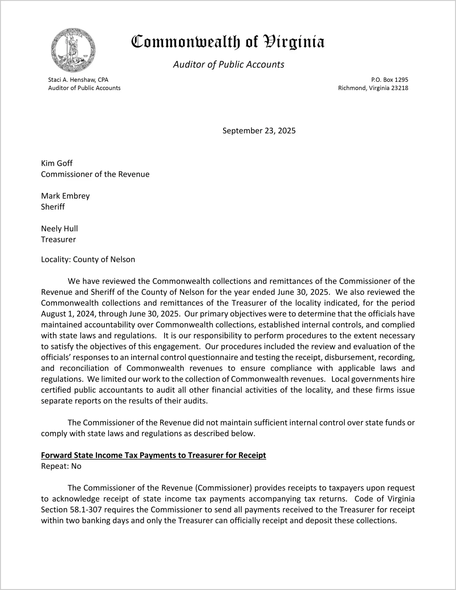 Commonwealth collections and remittances of the Commissioner of the Revenue and Sheriff of the County of Nelson for the year ended June 30, 2025