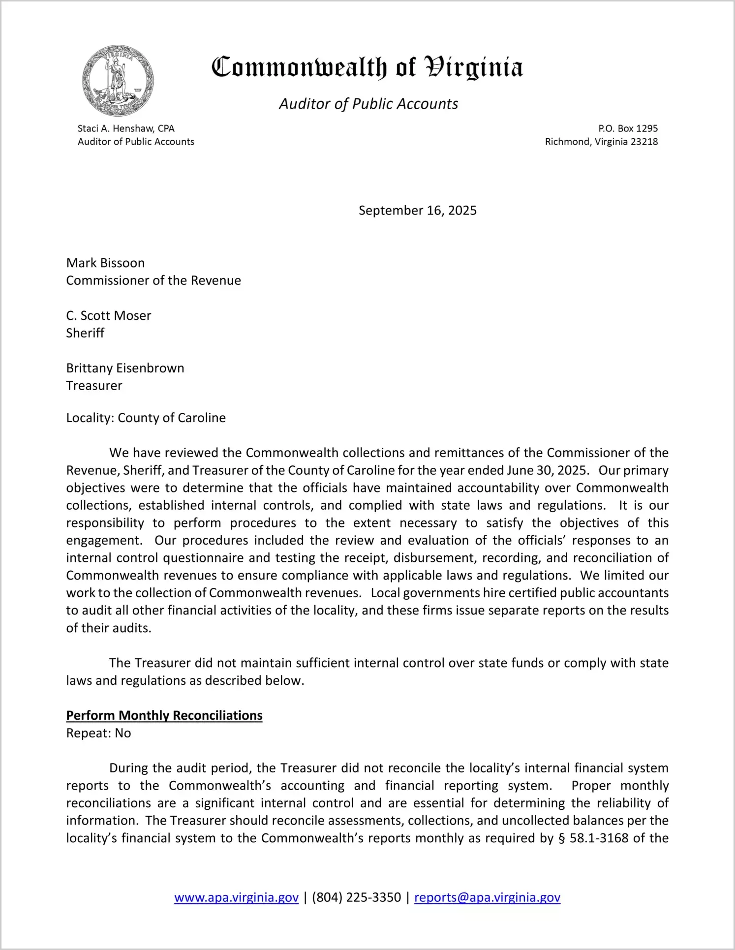 Commonwealth collections and remittances of the Commissioner of the Revenue, Sheriff, and Treasurer of the County of Caroline for the year ended June 30, 2025