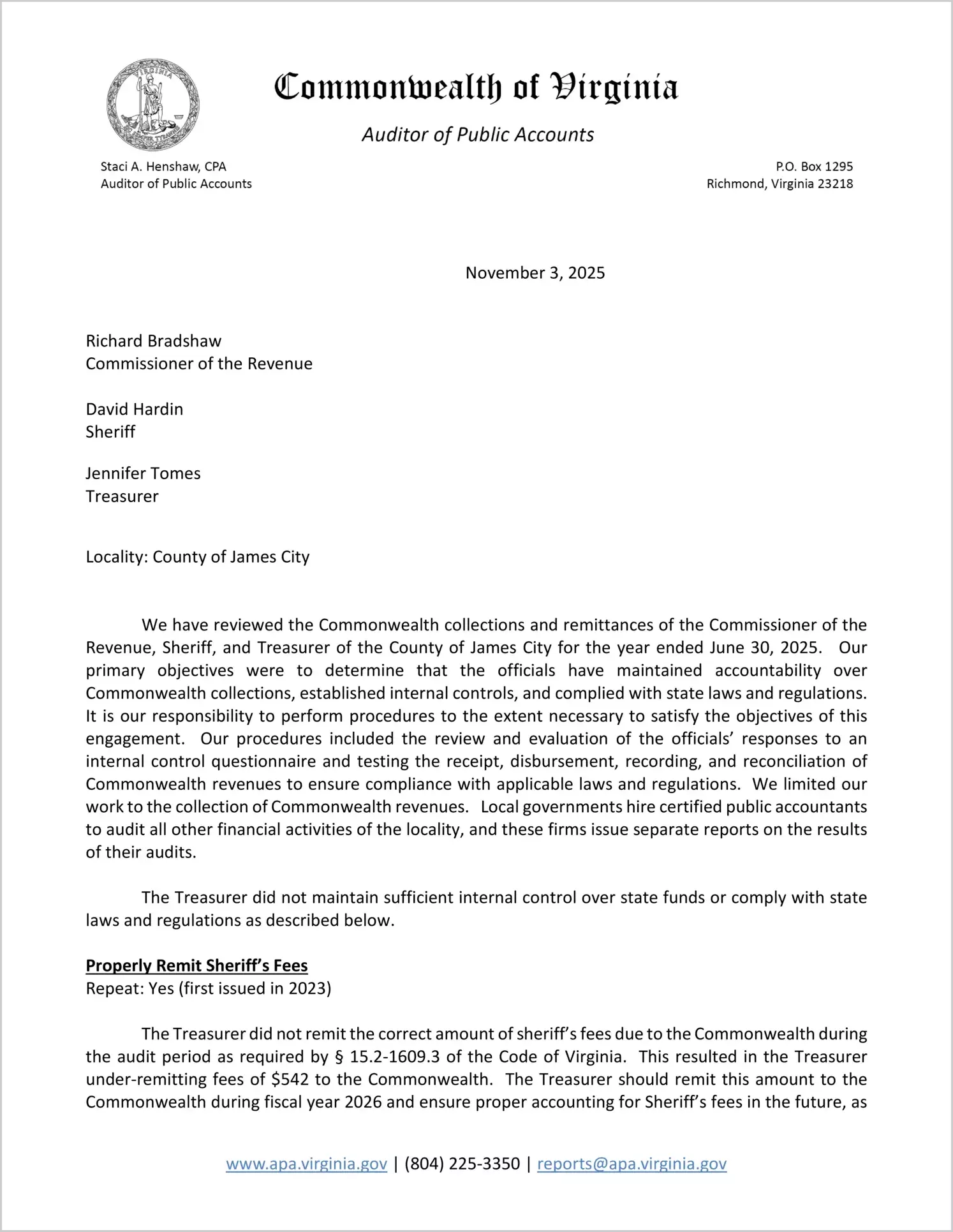 Commonwealth collections and remittances of the Commissioner of the Revenue, Sheriff, and Treasurer of the County of James City for the year ended June 30, 2025