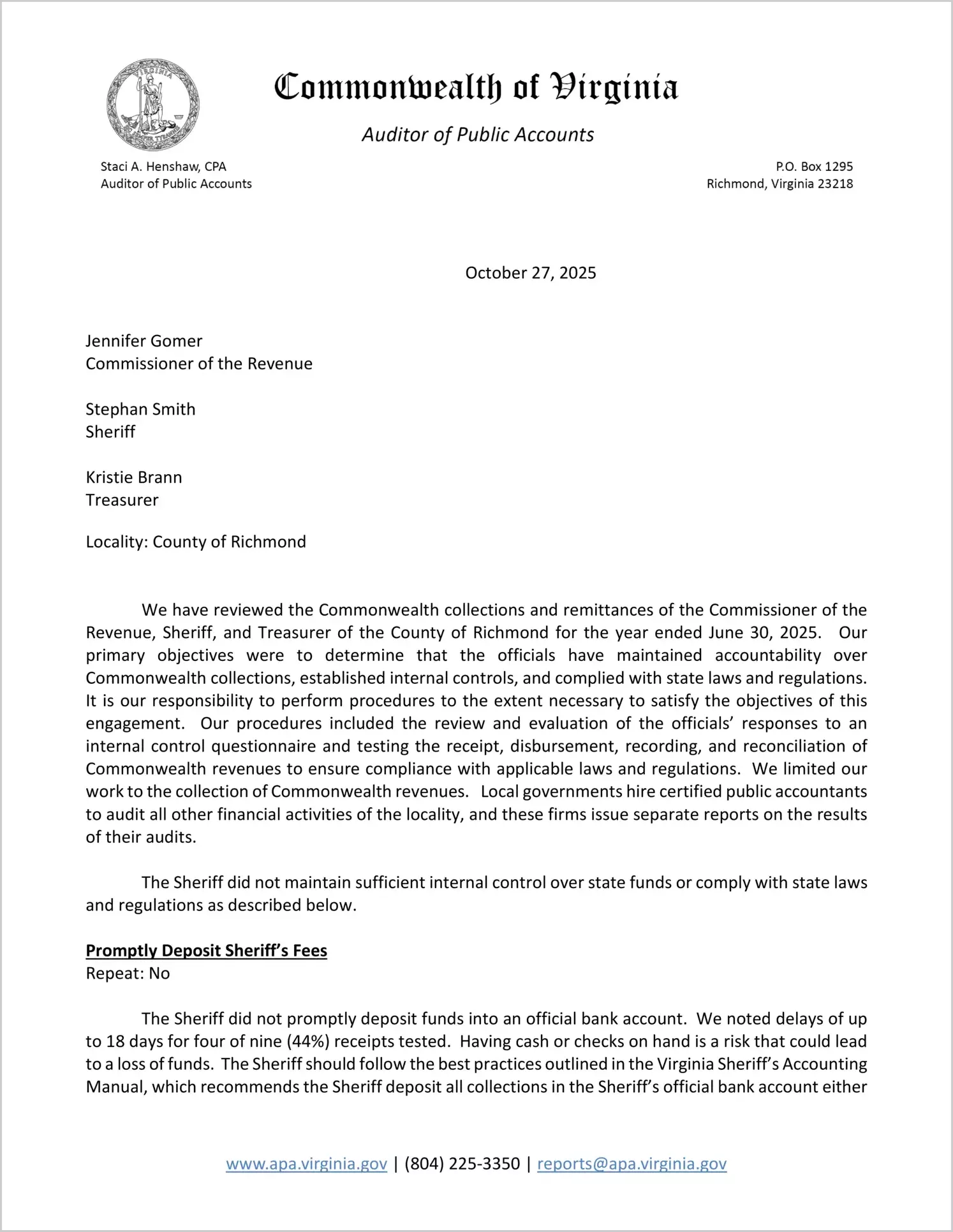 Commonwealth collections and remittances of the Commissioner of the Revenue, Sheriff, and Treasurer of the County of Richmond for the year ended June 30, 2025