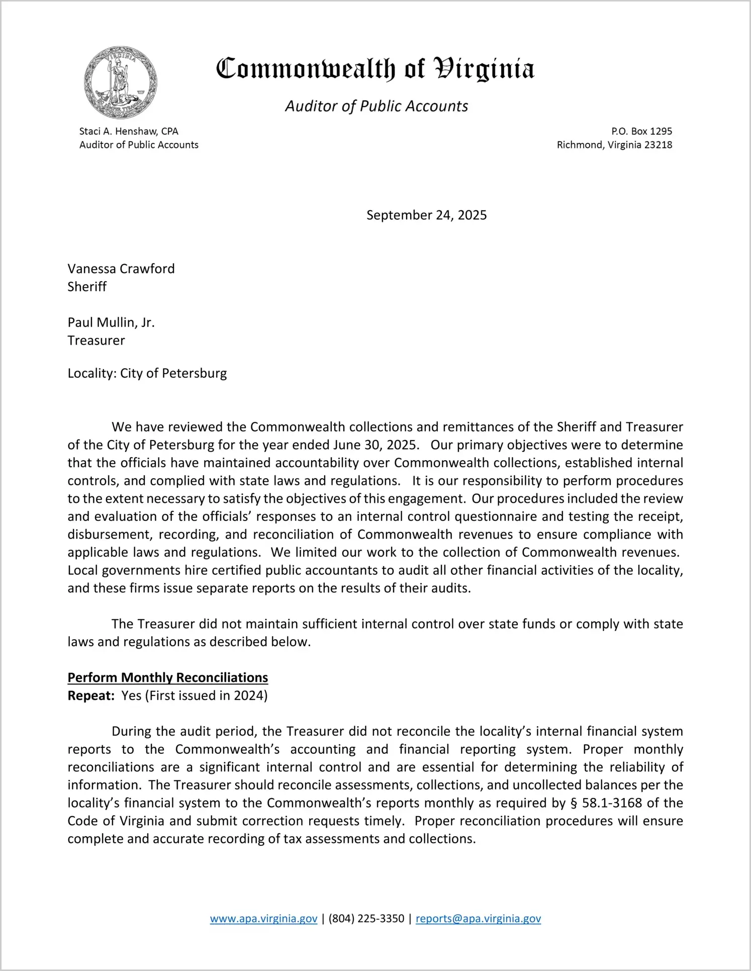 Commonwealth collections and remittances of the Sheriff and Treasurer of the City of Petersburg for the year ended June 30, 2025