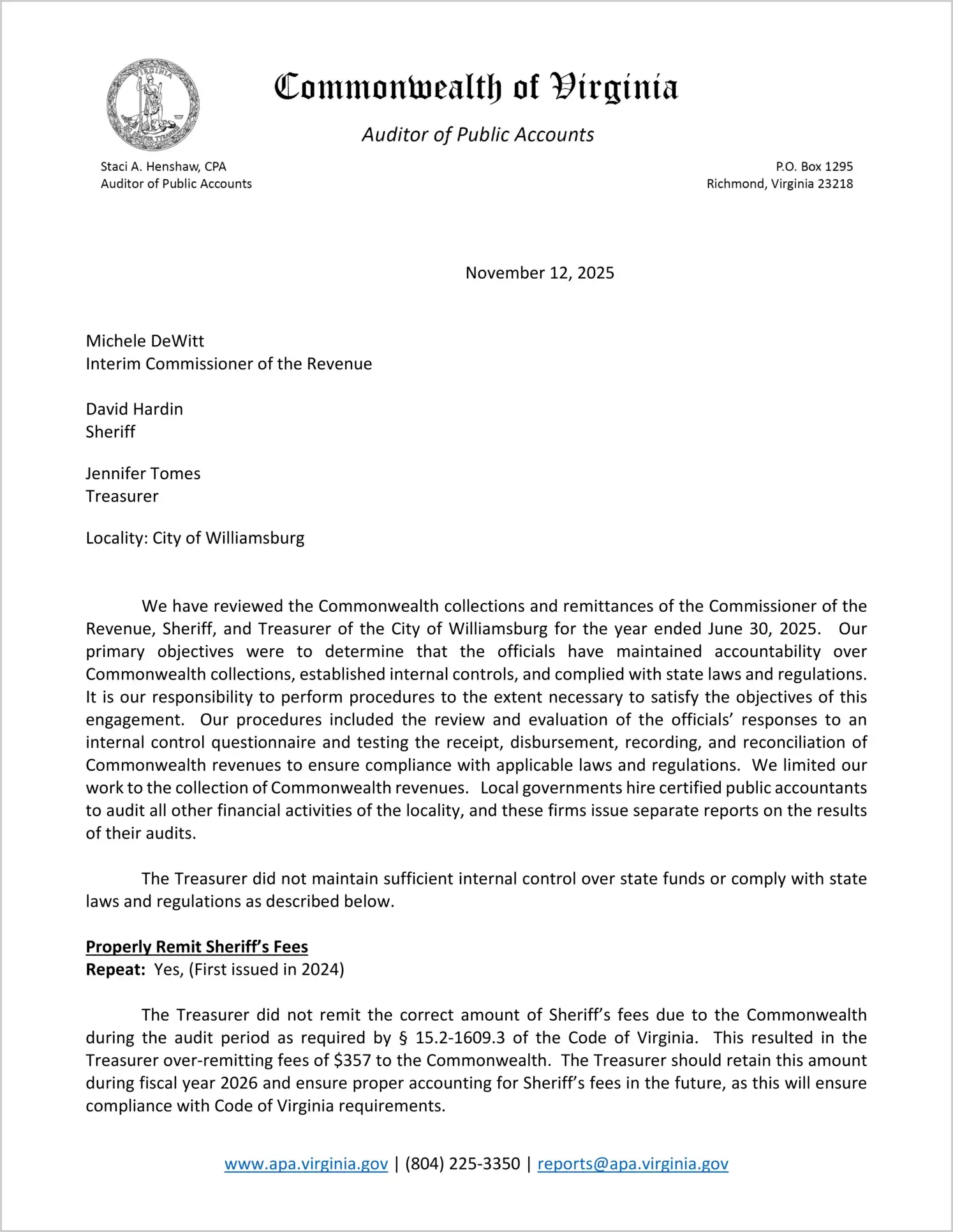 Commonwealth collections and remittances of the Commissioner of the Revenue, Sheriff, and Treasurer of the City of Williamsburg for the year ended June 30, 2025